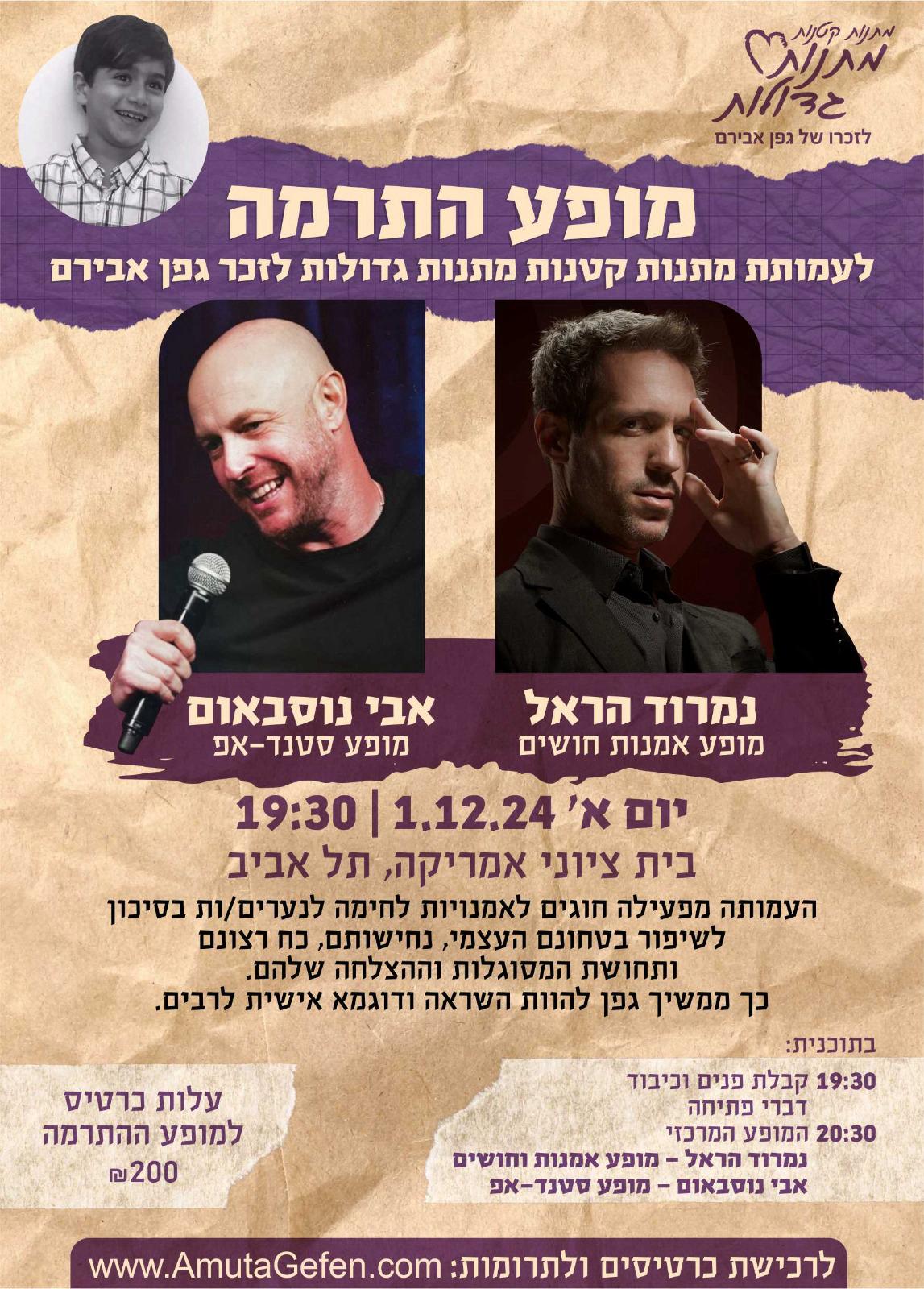 ארוע התרמה לעמותת מתנות קטנות מתנות גדולות לזכר גפן אבירם , עם אבי נוסבאום ונמרוד הראל , למימון פעילות קרב מגע לנערים/ות בסיכון