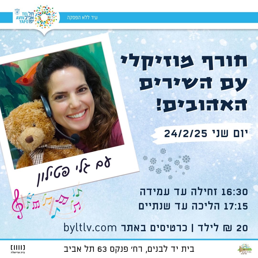 אח איזה חורף - פעילות אינטראקטיבית ומוסיקלית לקטנטנים! הצטרפו למסע חורפי, מרגש ומלא הפתעות! יחד נחווה יום חורפי וקסום מזריחה ועד שקיעה, נעזור לדוּבִּי-בּוּבִּי המצונן להרגיש יותר טוב, נגלה תרופה סודית וטעימה שמתחבאת בפירות ההדר ונשיר לגשם. יהיה חמים ונעים.