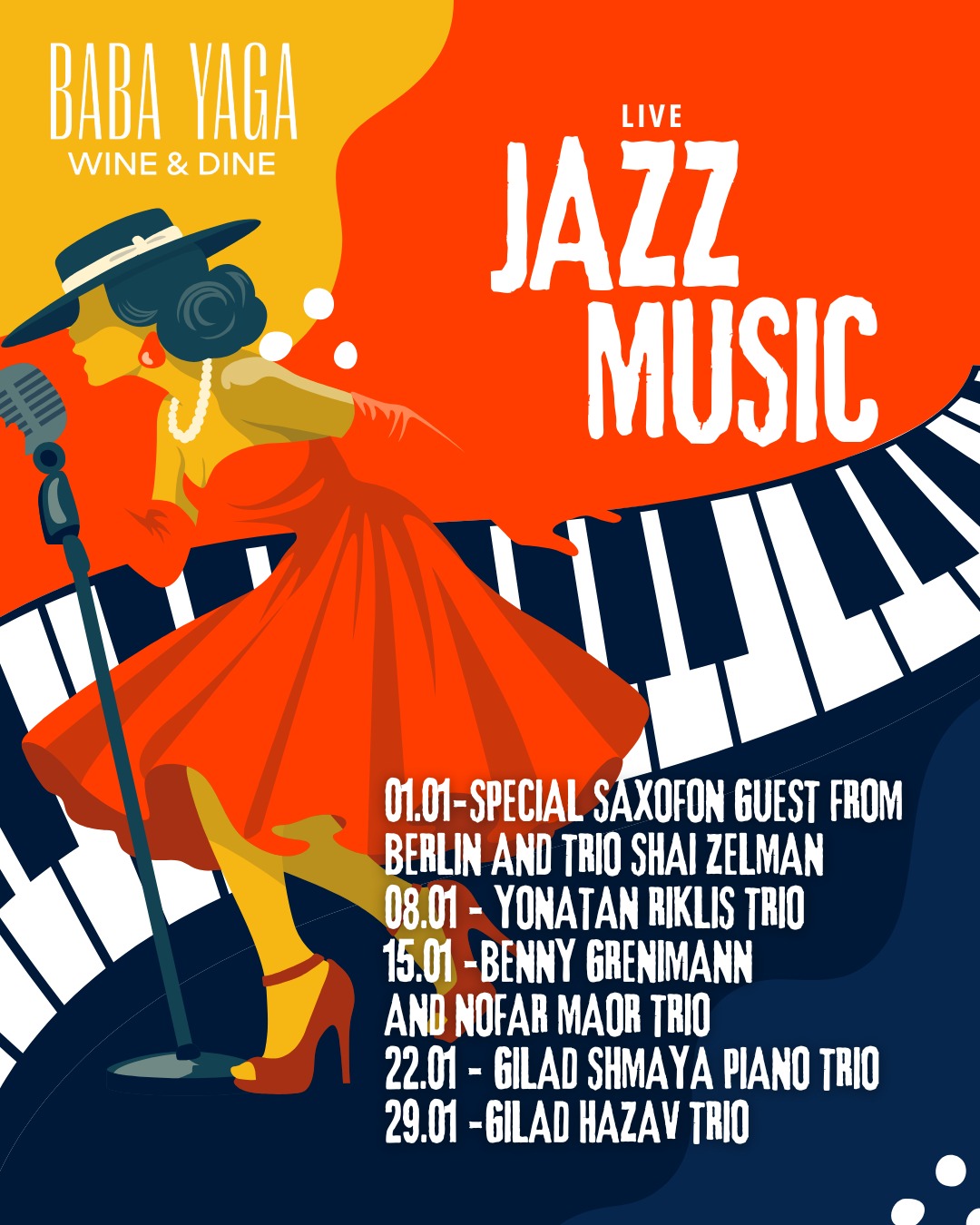 ערבי ג'אז ויין במסעדת Baba Yaga ✅ 1.01 – שי זלמן טריו בהשתתפות אורח סודי מברלין (סקסופון) ✅ 8.01 – טריו יונתן ריקליס ✅ 15.01 – בני גריינימן (קלידים/סקסופון) וחברים ✅ 22.01 – גלעד שמעיה טריו פסנתר ✅ 29.01 – גלעד חצב טריו פסנתר בכל יום חמישי בשעה 19:30 במסעדת Baba Yaga, מופיעים מיטב נגני הג'אז בישראל, בואו להאזין למוסיקה נפלאה ולהנות מיין איכותי ללא הגבלה. עלות הכרטיס 98 ש"ח כוללת יין ללא הגבלה. כתובת: תל אביב, רח' הירקון 12 טלפון: 03-517-517-9 שתייה מופרזת של אלכוהול פוגעת לבריאותכם.
