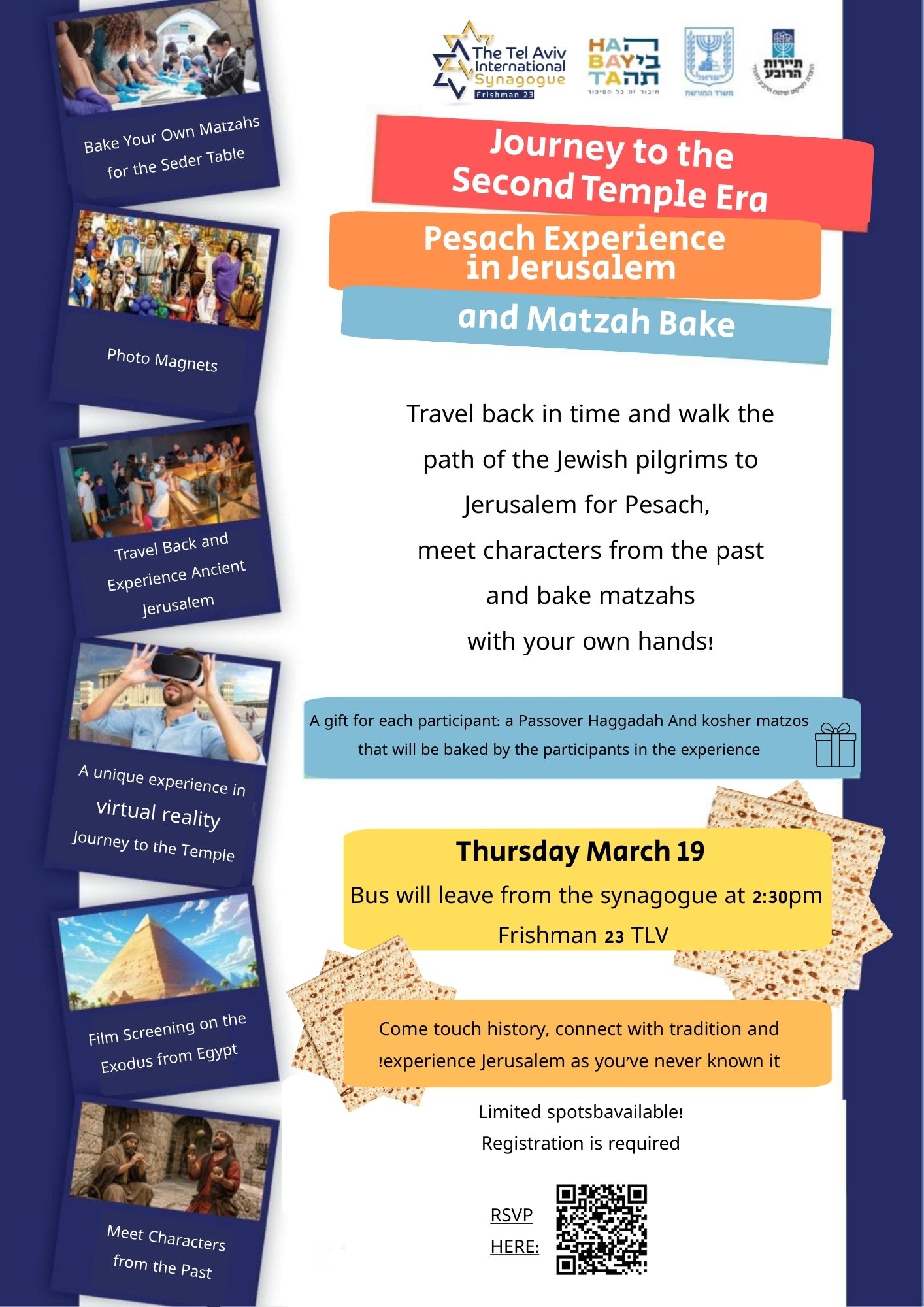 Travel back in time and walk the path of the Jewish pilgrims to Jerusalem for Pesach, meet characters from the pas and bake matzahs with your own hands!