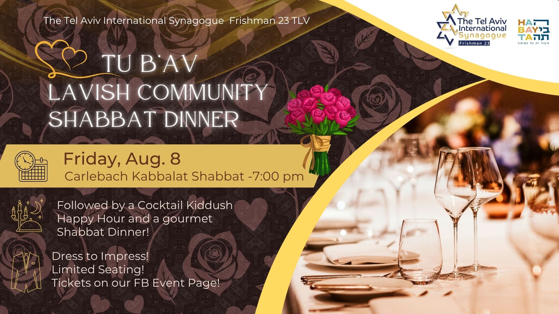 Join TLV's Young International & Israeli Community and come and celebrate Shabbat Tu B'Av with a delicious 4 course Shabbat Dinner, quality wine and drinks, energy, spirit and words of inspiration!