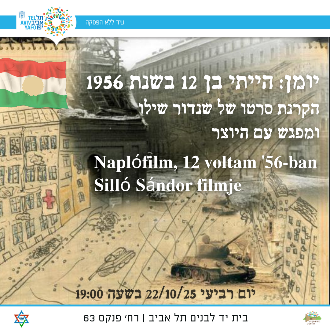 מפגש מרתק עם הבימאי ההונגרי שנדור שילו והקרנת סרטו התיעודי "יומן - הייתי בן 12 בשנת 56". בערב ישתתפו עולים מהונגריה שהיו עדים למרד של שנת 1956 ואף נטלו בו חלק. אנו מעודדים עדי ראייה נוספים להגיע ולספר מחוויותיהם.